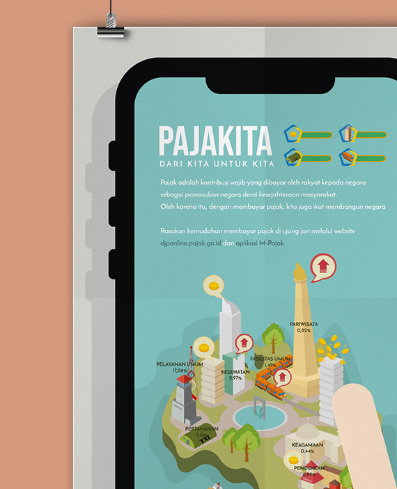A group project to make a poster to encourage young people to pay tax and understand what tax is. The team saw that young people are into gadgets and games, they use their phone for almost everything. The idea is paying tax in Indonesia is easy since there's an app to help you, it's just one click away, it's in your hand. The team also want to tell the importance of paying tax, such as infrastructure and public facility, is for their own good.